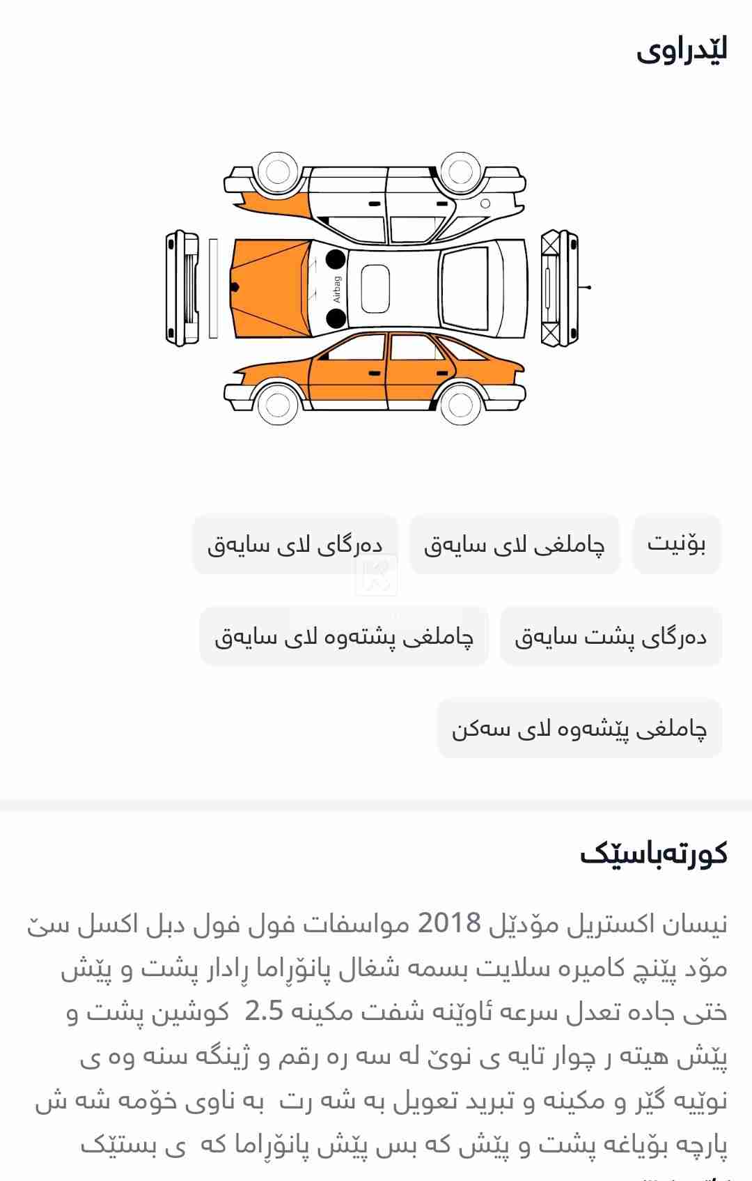 نیسان اکستریل مۆدێل 2018 مواسفات فول فول دبل اکسل سێ مۆد پێنچ کامیره سلایت بسمه شغال پانۆڕاما ڕادار پشت و پێش ختی جاده تعدل سرعه ئاوێنه شفت مکینه 2.5 کوشین پشت و پێش هیته ر چوار تایه ی نوێ له سه ره رقم و ژینگه سنه وه ی نوێیه گێر و مکینه و تبرید تعویل به شه رت به ناوی خۆمه شه ش پارچه بۆیاغه پشت و پێش که بس پێش پانۆڕاما که ی بستێک ساردی هه یه (07507566721)ڤایبه ر واتسئاپ،