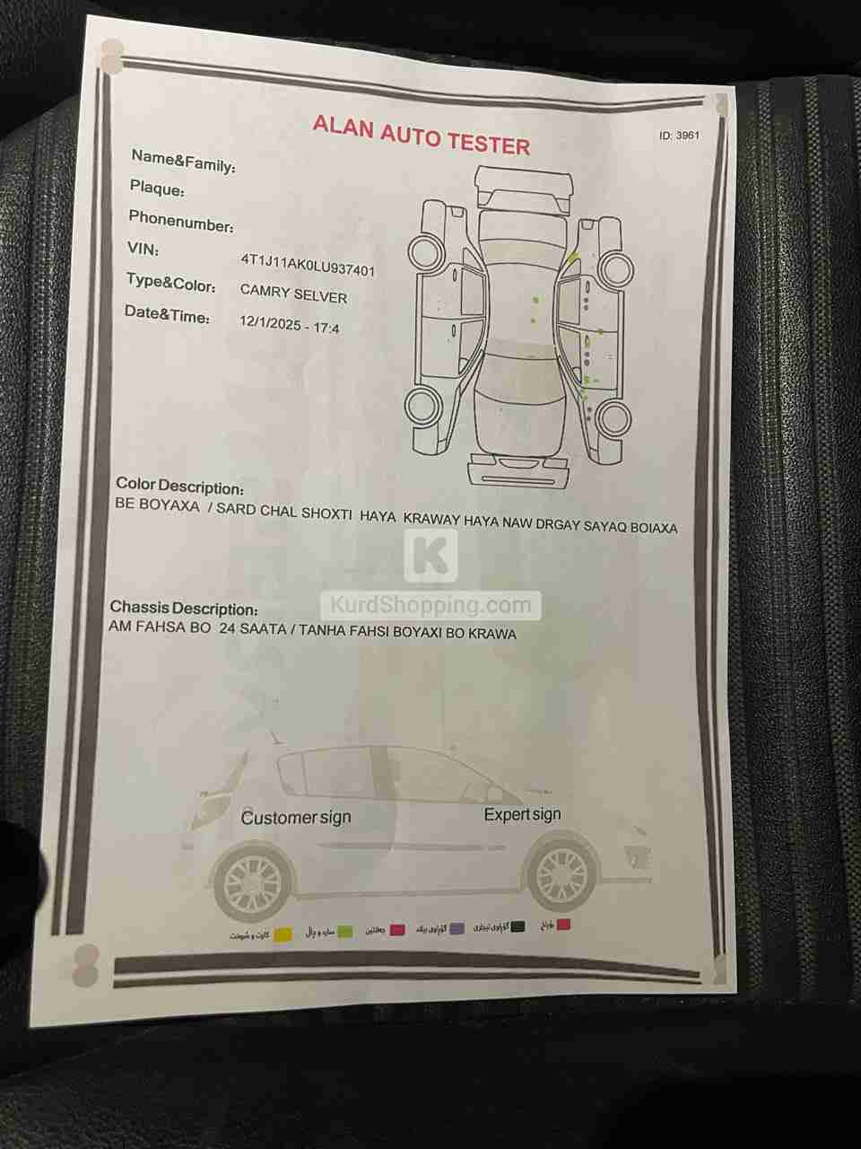 تۆیۆتا کامری ٢٠٢ +se بەسمەیە شغالە سلاید و شاشە گەورە و کوشیین جلد و گێری سوکان و وایەرلێس چارج ٣٦٠پلە رادار راداری ئاوێنەو کامل حاسە تەبرید مەرکەزیە بلاک تۆپە سەیارەکە ٨٠ هەزار مایل ڕۆشتوە بە زەمان کامل سێرڤز کراوە ٤ تایەی لۆکی لەژێرە ٣پارچەی گۆراوە بە بیلاد یەک پەلە پیدیئار بە چەمەلخی دواوەیەتی پشت و پێشی کەپسە ٢١٥ وەرەقە سلێمانی 4T1J11AKOLU937401 07725327358