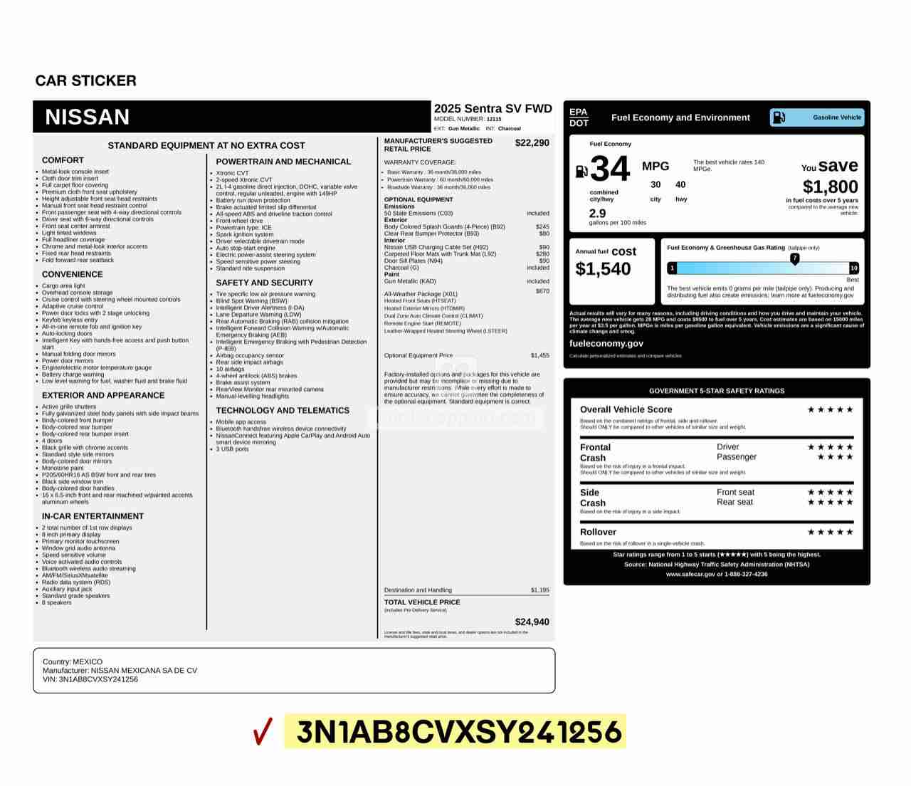 نیسان سنترا ٢٠٢٥ ١٢٠٠ مایل رۆشتووە 3N1AB8CVXSY241256 ‎ سه يارەکە كاتى دهوّكه،بەس ليوى بونیت تعدیل مواسەفات sv شغال،بەسمە،کامیرا،ڕادار،خەتی جاددە،usb,Carplay ‎خەتی جاده، شاشە، ‎كوشين وسوكان و ئاوينه هیتەر، ‎سوكان جلد بلادى، تحكم ساردى و گەرمی و هەردوولا